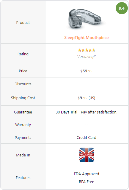 It is FDA Cleared and can be used with other accessories like nose strips, CPAP and chin straps to be more effective. The SleepTight Mouthpiece offers a risk free 30-day trial for just $9.95.